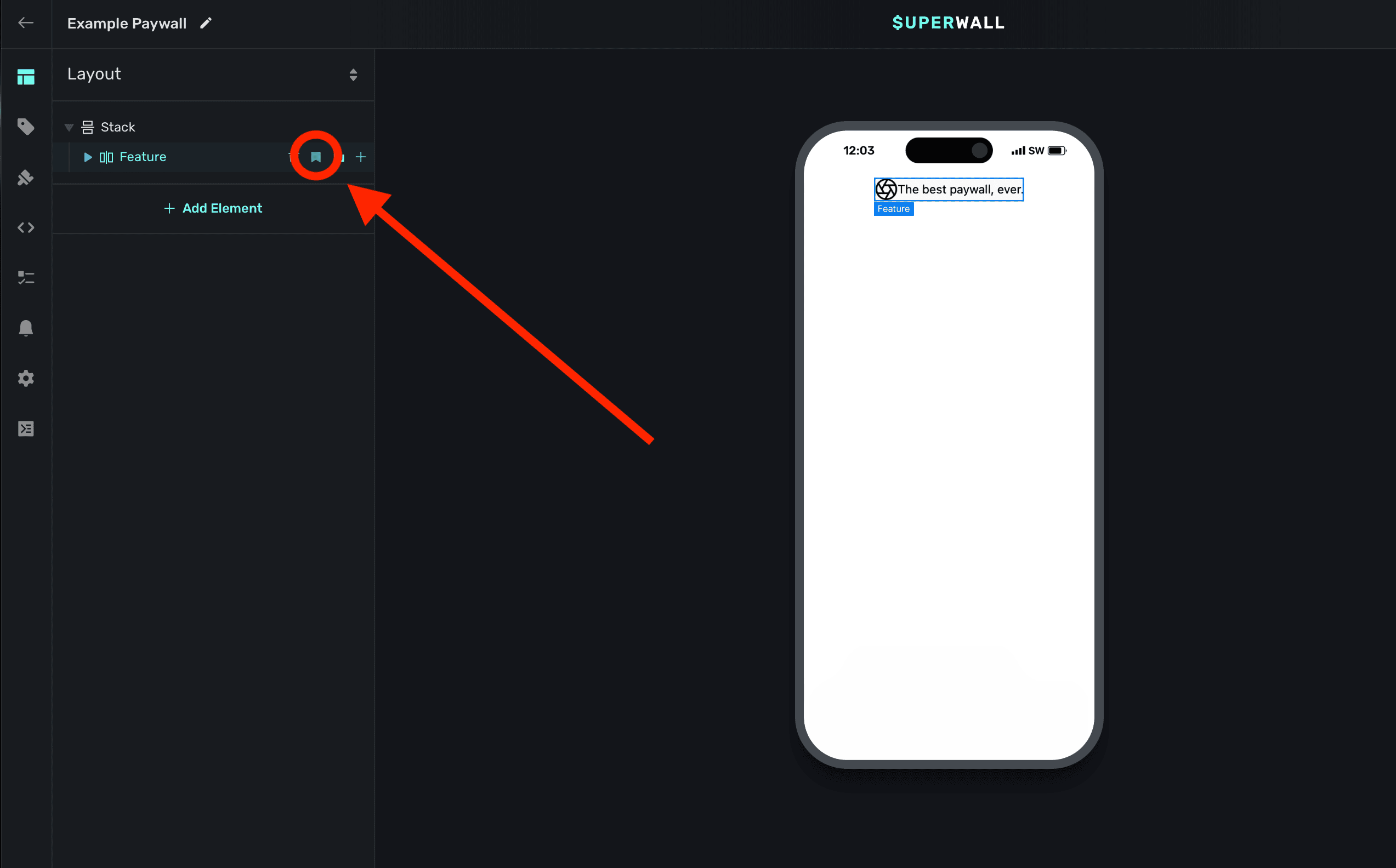Click the + in the left sidebar or in the Layout tab to select an element to add to your paywall. This will present our library of components along with any snippets you've made (along with some of our own stock recipes):