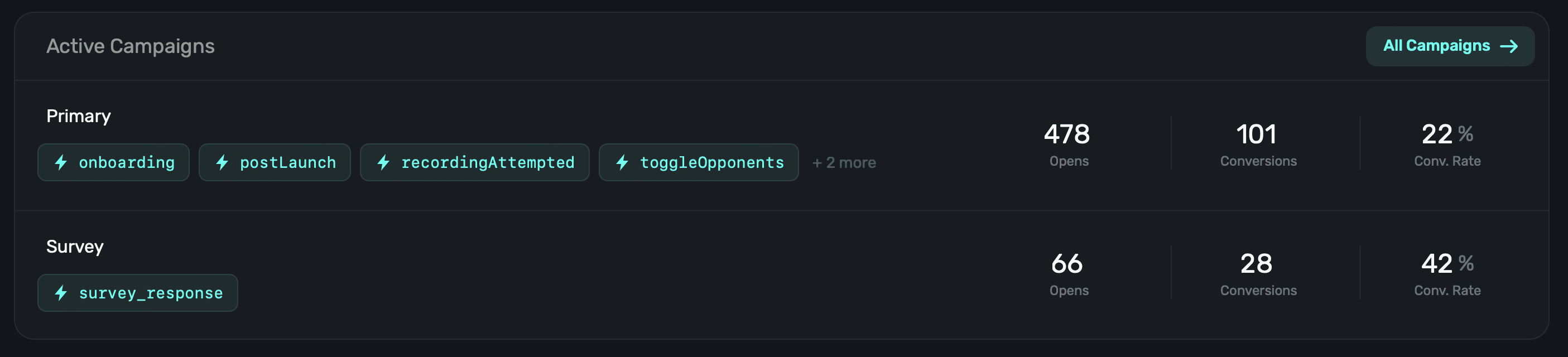 - Campaigns: Breakdowns of your active campaigns.